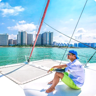乘银滩豪华双体帆船游艇出海,运行平稳不易晕船,如移动海上别墅,船头超大网兜可以躺着、坐着、站着出海让你尽情享受日光浴和自拍,宽大的甲板可360°欣赏美景,更是观赏日落的绝好位置。