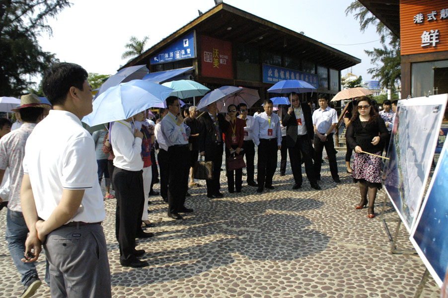 图一为香港客人认真听取北旅集团公司董事长张实(右一)介绍银滩规划蓝图,北旅集团总经理助理、北海银滩景区管理有限公司总经理苏志贤(左一)陪同。