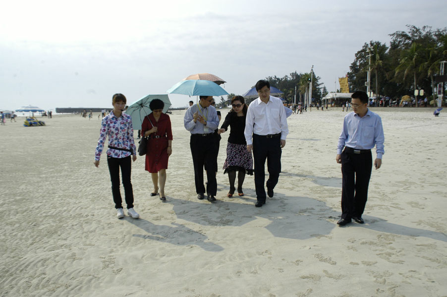 图二为2013年3月22日,香港工商界知名人士广西考察团一行考察参观北海银滩,北旅集团董事长张实(右三)向客人介绍银滩发展情况。北海市委常委、统战部部长毛艳琼(左二)、北海市副市长刘宏武(右二)陪同考察。