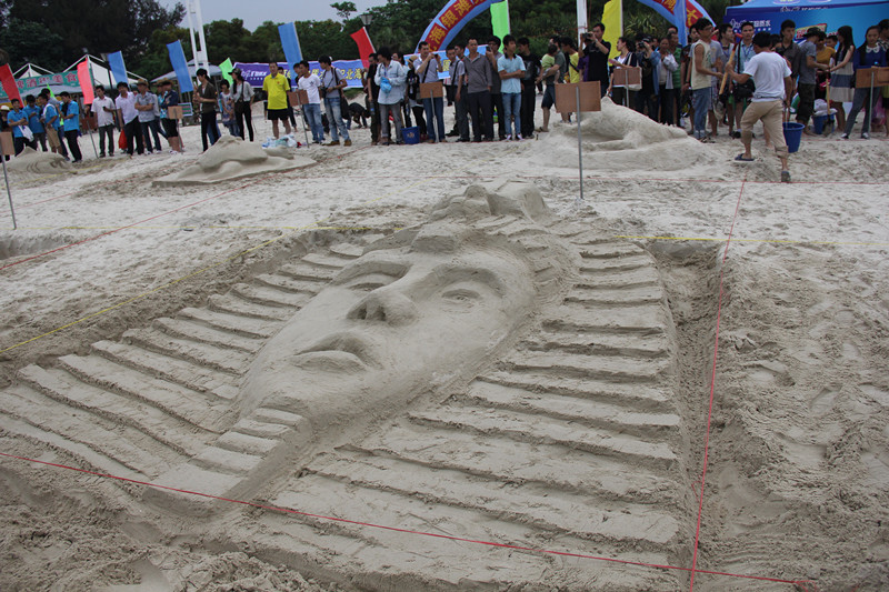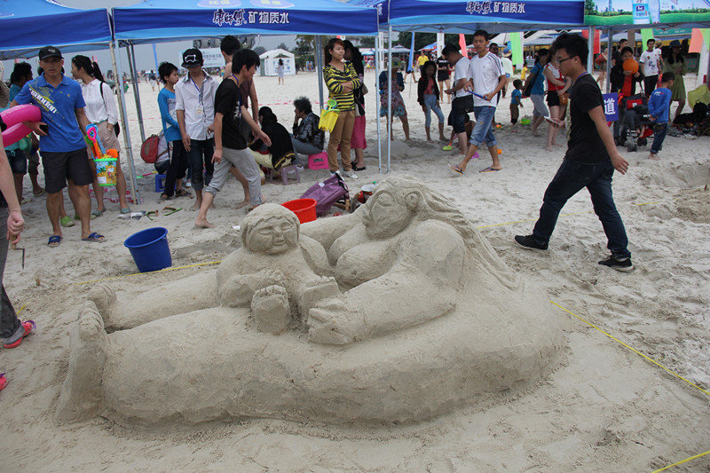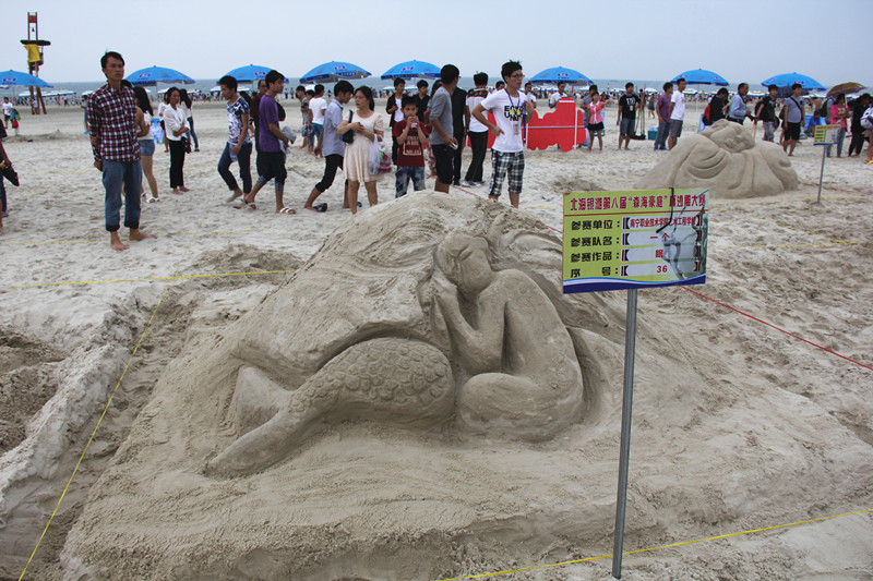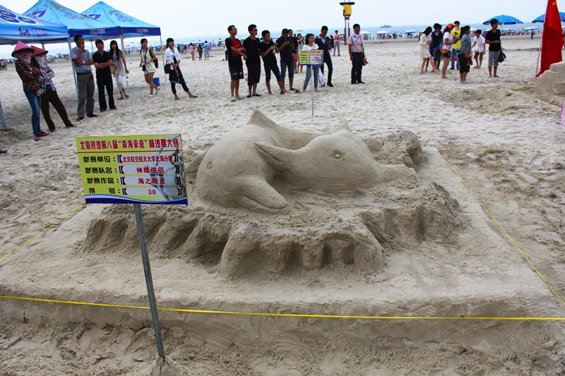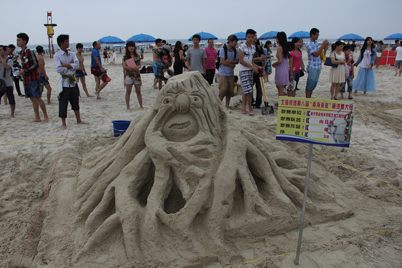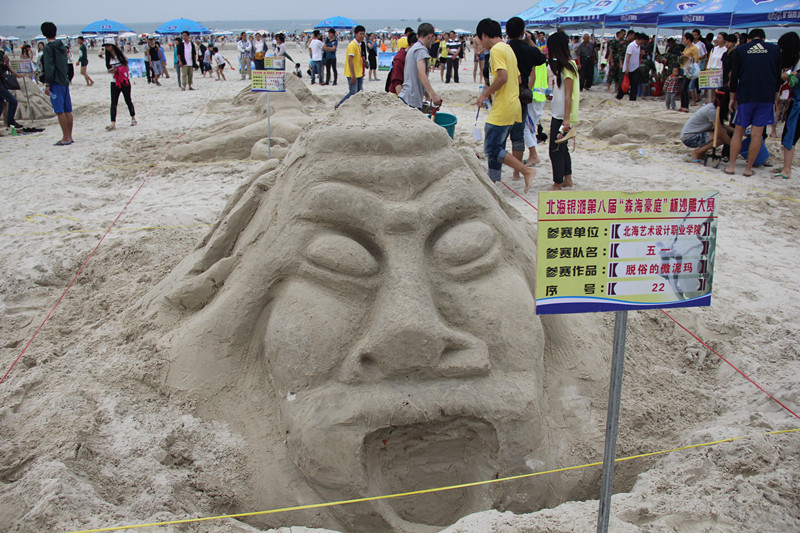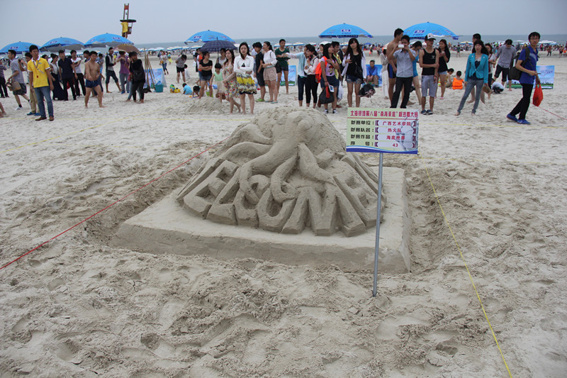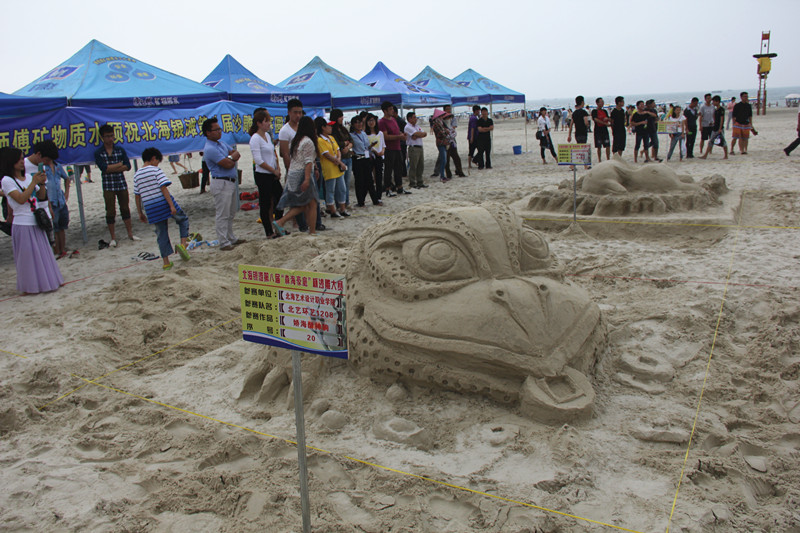 大赛现场热闹非凡,各沙雕造型形态逼真、栩栩如生。吸引不少游客参观,合影留念。最后由广西艺术学院参赛队伍乌托邦的作品《沙出个黎明》荣获一等奖。