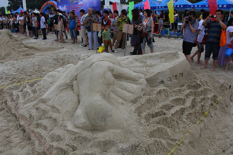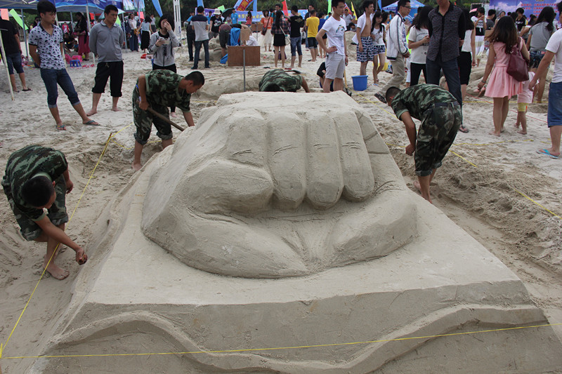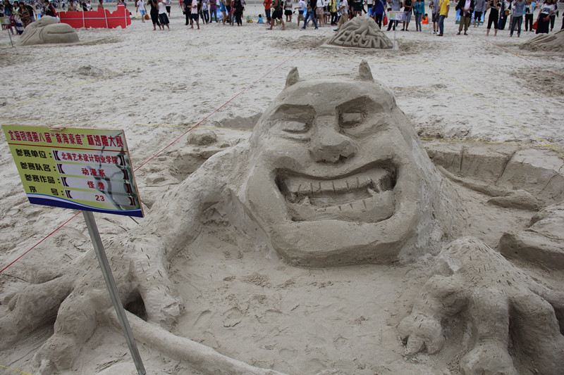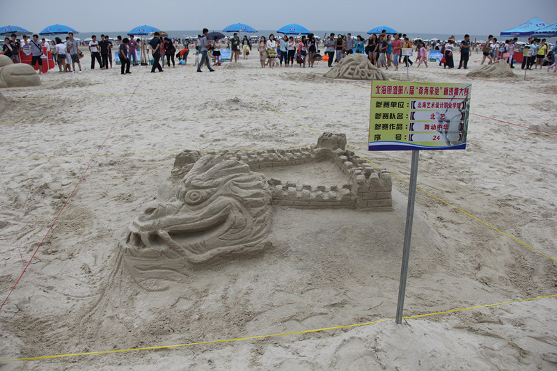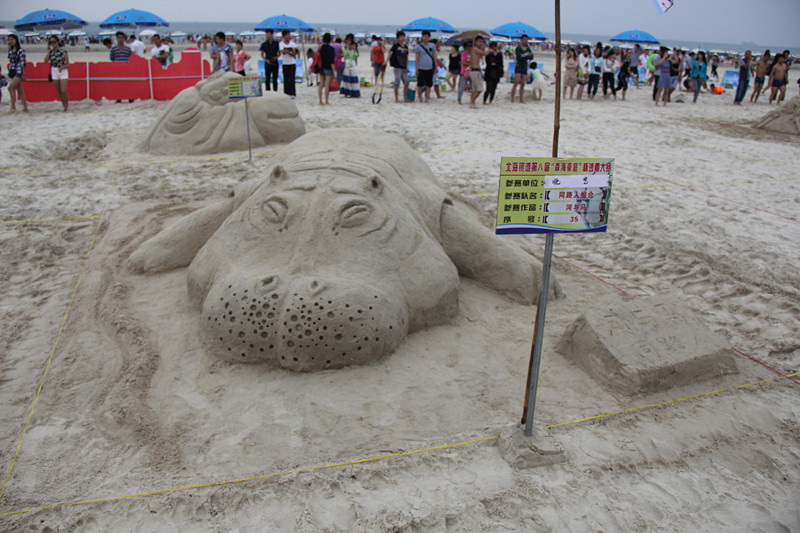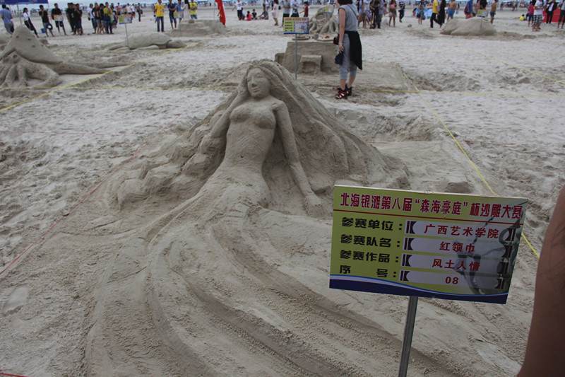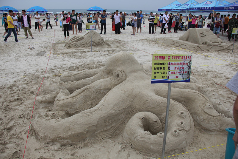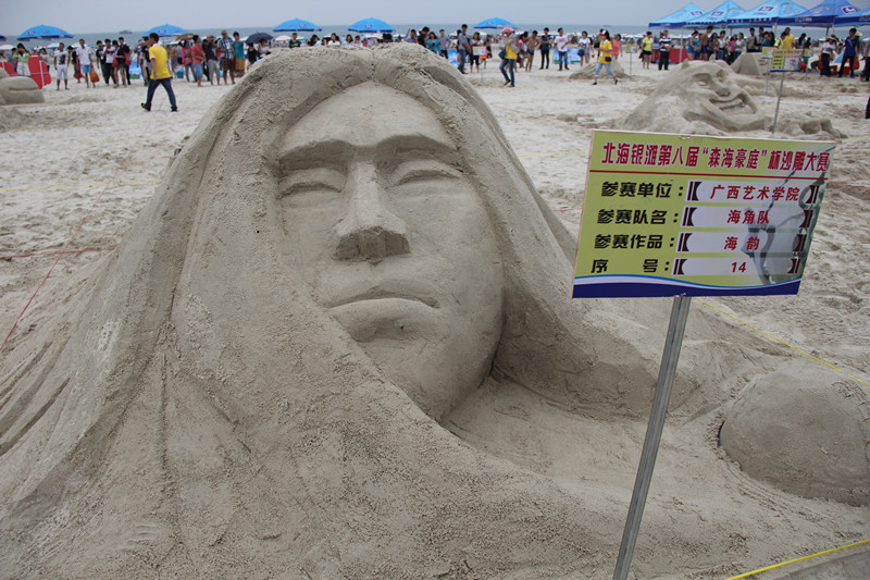 大赛现场热闹非凡,各沙雕造型形态逼真、栩栩如生。吸引不少游客参观,合影留念。最后由广西艺术学院参赛队伍乌托邦的作品《沙出个黎明》荣获一等奖。