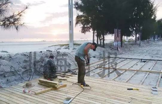 由政府财政投入约400万元实施的北海银滩景区基础设施改造工程正在顺利推进,该工程从10月下旬开始,主要对银滩公园、海滩公园沿岸木栈道进行全面改造更新铺设,为国内外游客到北海银滩游览提供更加舒适、安全的旅游环境。