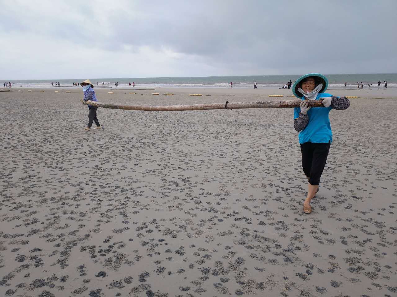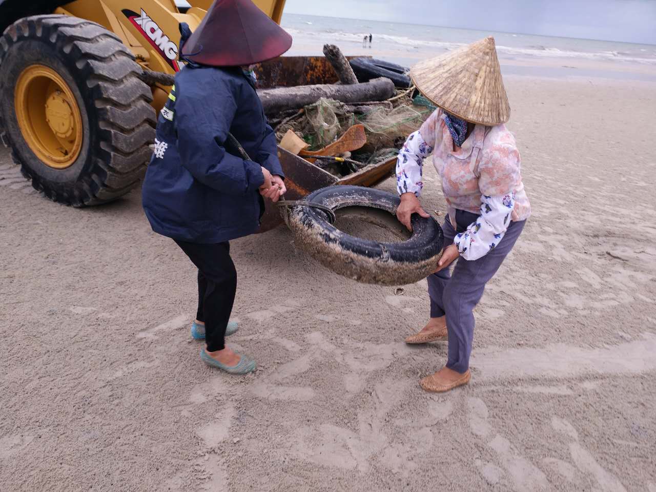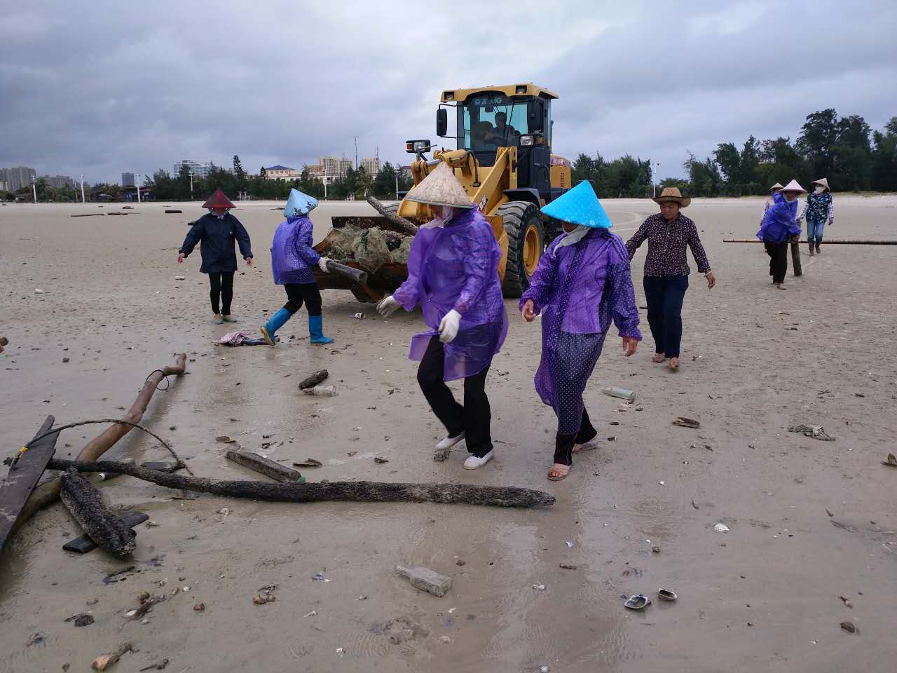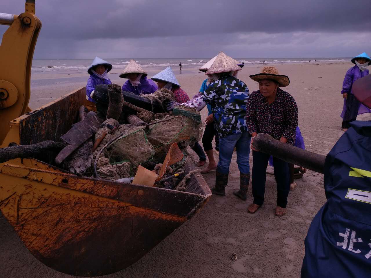 图为银滩环保部在清理从海上刮上沙滩的螺场腐木长竹等垃圾,共计3推土机,6-7吨。