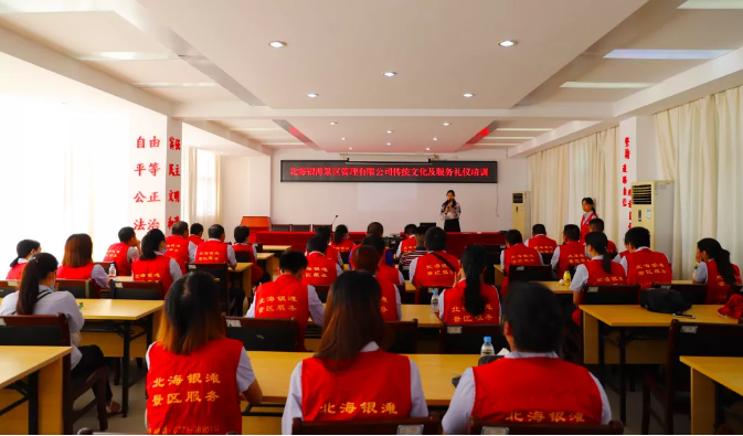 为积极推动传统文化教育、弘扬传统文化,着力引导职工将“孝、勤、和、礼、耻、俭、善、诚”融入到服务中来,全面提高综合服务水平和品行素养,切实将优质服务传递给每一位游客, 9月12日,北海旅游集团旗下银滩景区公司组织中层管理人员及服务人员共计120人开展了传统文化及服务礼仪专题培训。