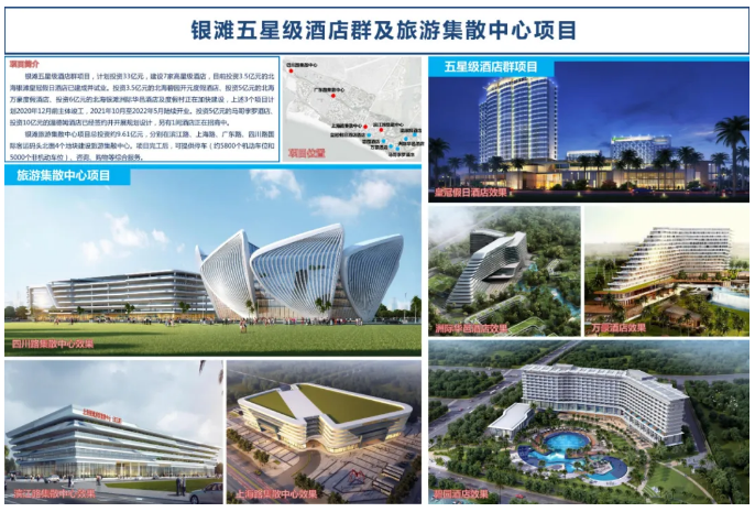 目前已有4个高星级酒店在银滩中区开工建设,其中银滩皇冠假日酒店,于2015年开工建设,总投资约3.5亿元,2019年9月份完工并开业。