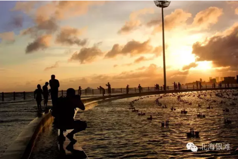 海滩公园里有亚洲最大的音乐雕塑喷泉,它就是号称亚洲第一钢塑的“潮”,由北海人、中央美术学院副教授魏小明设计,由中房北海公司投资1000多万元,耗时两个月零15天建成。整座雕塑高23米,钢球直径20米。巨大的钢球用不锈钢镂空制成,以象征一颗大明珠的球体和七位裸体少女护卫球为主体,以大海、潮水为背景,使传统的人文精神与现代雕塑建筑艺术融为一体,形成完美和谐的统一体。它由环绕着的5250个喷头和3000盏水下彩灯组成,互为映衬,显示出海的风采,构成了潮的韵律。每天晚上有4次喷泉表演,每次15分钟。
